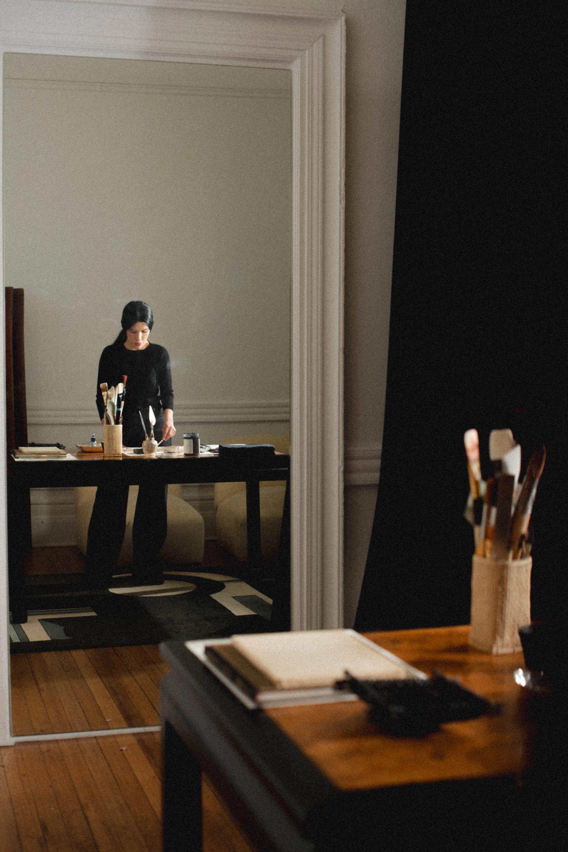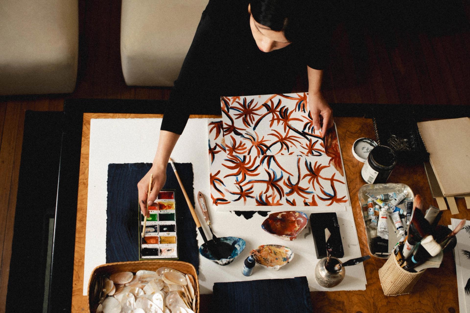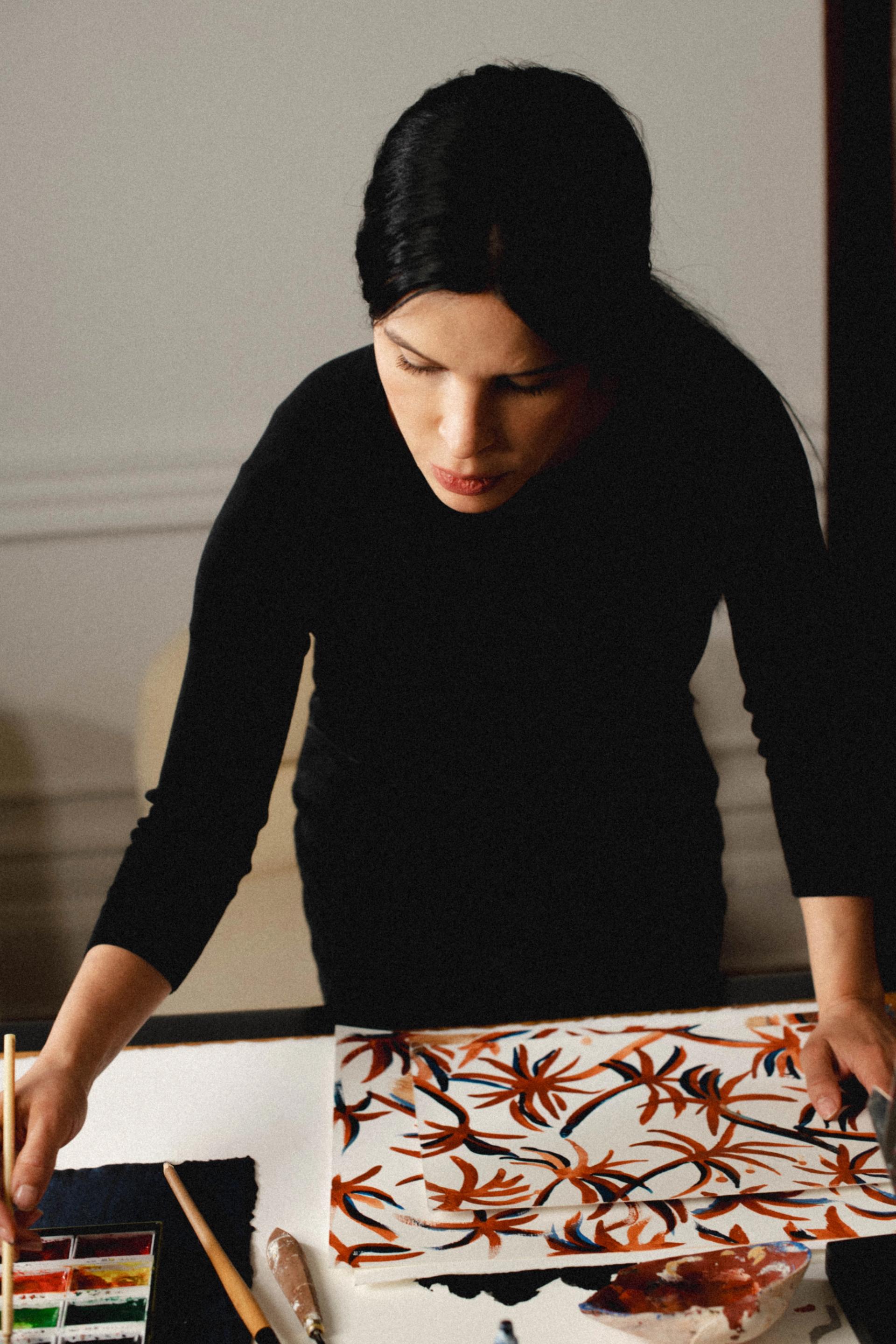 The images trace this path from place to process. Palm trees from Choroní stand beside studies of pigment and texture, translating landscape into cloth. Photographs of the palm trees are by Conrado Véliz. The studio process was captured by Pedro Santos. Realization by Ariana Díaz and editorial direction by David De Lima.