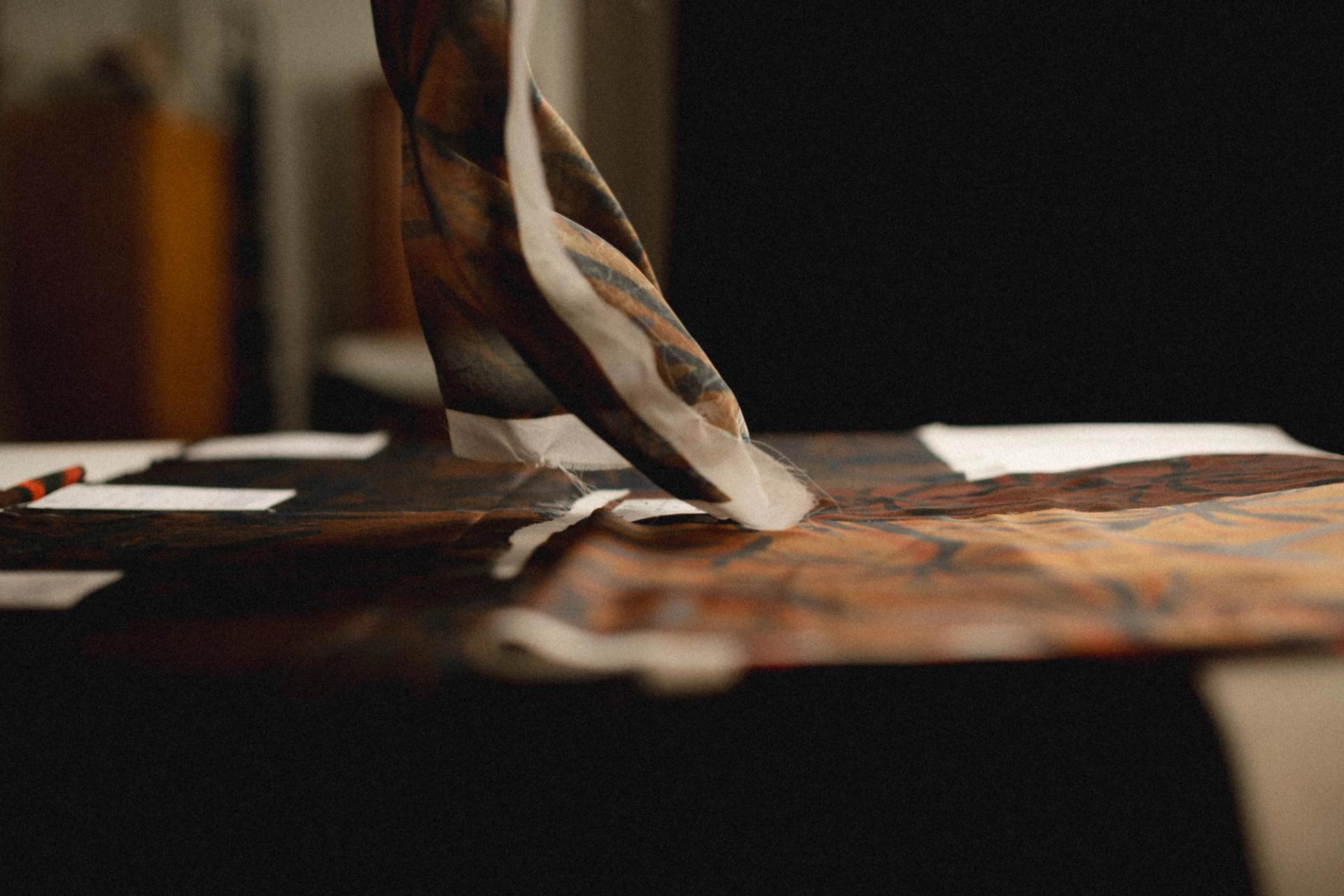At its center is the main fabric of the season, a textile that defines the collection. It is a reinterpretation of the palm trees of Choroní, seen in dialogue with the vision of Venezuelan painter Armando Reverón. Reverón, who lived on the Caribbean coast, sought to capture the intensity of light through raw surfaces and muted palettes. His search for luminosity became a guide, joining with the memory of palm and shadow to shape a fabric that is dark, earthy, and intricate, layered with detail, dense with rhythm, alive with repetition.