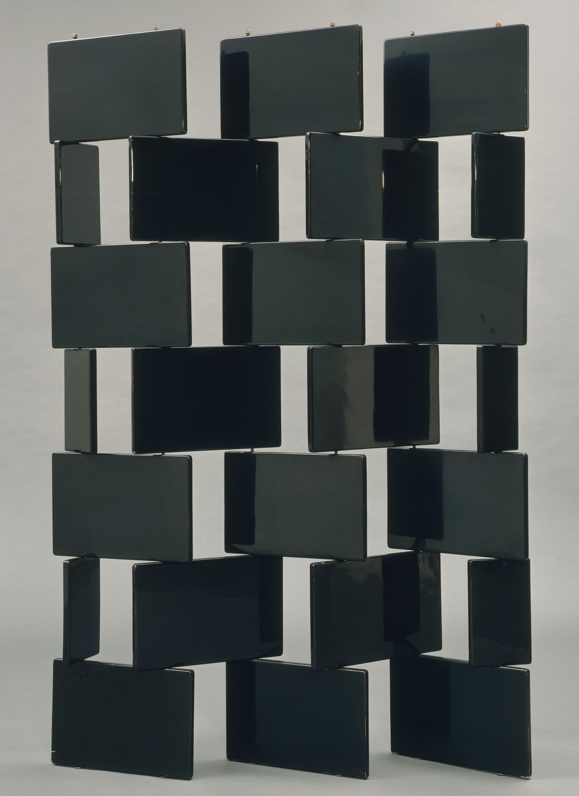 Shown: Eileen Gray, Black Lacquer Screen, 1920s, and Sara Cristina, Sketch of the Black Mesh Woven from Cotton.